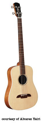 ALVAREZ | ACOUSTIC ELECTRIC BASS | | 4070 ACOUSTIC BASS | - single round jumbo style, laminated spruce top, round soundhole, three-stripe bound body/rosette, mahogany back/sides/neck, 23-fret rosewood fingerboard, rosewood bridge with white black dot pins, bound rosewood peghead with pearl logo inlay, two-per-side die-cast tuners, piezo bridge pickups, three-band EQ, available in Natural gloss finish, mfg. 1994-98. |