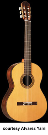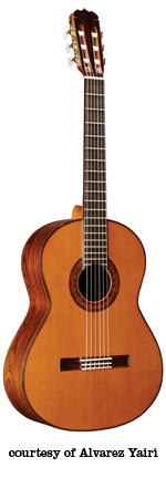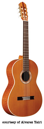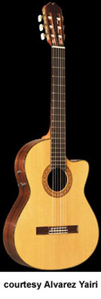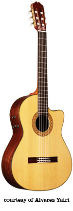 CY 127 CE CUTAWAY CLASSIC | - shallow depth classical style body, rounded cutaway, solid cedar top, round soundhole, multi-layer wood body binding, wood mosaic rosette, rosewood back/sides, mahogany neck, 12/19-fret ebony fingerboard, rosewood bridge, slotted headstock, three-per-side gold tuners with pearloid buttons, Alvarez Natural Response pickup system and volume/tone control, available in Natural gloss finish, mfg. 1991-2004. |