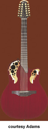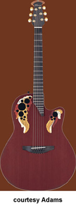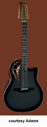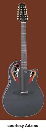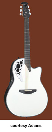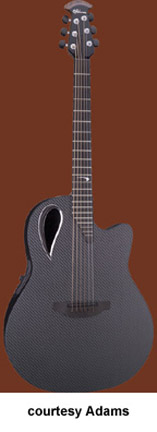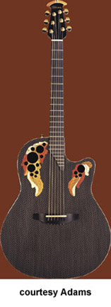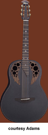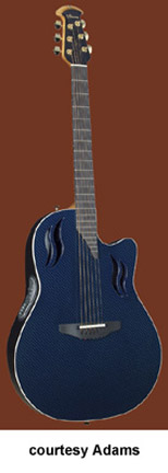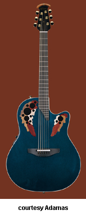 ADAMAS | ACOUSTIC | The first production Adamas was introduced in 1976. The model designation is unknown currently, but was available with a Blue, Green, Red, Natural, or a Black finish. Pricing and specs are currently unknown and research is underway. Adamas also made two guitars with center soundholes: the W591, which was part of the CVT series, and the 6591, part of the SMT series. Adamas currently offers custom shop guitars where the customer starts with a base model and select options are available. Currently, Adamas features four base models for their Custom Shop program the 1581 (base MSR $3,999), the 1680 (last base MSR was $4,249), the 1687 (base MSR $4,099), the 2080 (base MSR $3,649), and the W2097 (base MSR $3,649). | CVT W597 | - single cutaway, mid-depth bowl-back body, cross weave carbon fiber top, five-piece mahogany/maple/ebony neck, 14/22-fret diagonal end ebony fingerboard, multi-soundhole, ebony bridge, three-per-side tuners, Adamas Hi-Output pickup, OP50 electronics, gold hardware, available in Graphite (4G), Bronze (BZ), and Cobalt Blue (CB) finish, mfg. 1999-2007. |