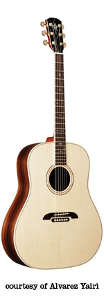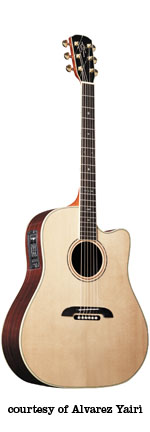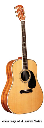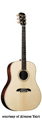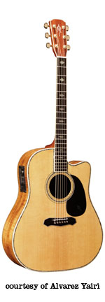 DY 91 | - dreadnought style, solid spruce top, round soundhole, abalone bound body and rosette, flamed koa back/sides, black pickguard with Alvarez Yairi logo in abalone, mahogany neck, 14/20-fret bound ebony fingerboard with abalone diamond inlay, abalone bound ebony bridge with black pearl dot pins, koa peghead veneer with abalone logo inlay, three-per-side gold tuners, optional System 500 Mk II (disc. 2001) or System 600T Mk II (2002-present) electronics, available in Natural gloss finish, mfg. 1994-present. |