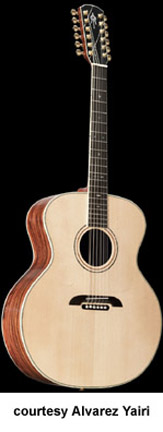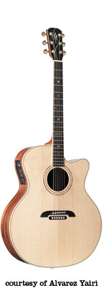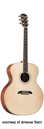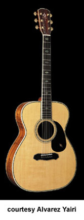 FY 91 | - folk style, solid spruce top, round soundhole, abalone bound body and rosette, koa back/sides, black pickguard with Alvarez Yairi logo in abalone, mahogany neck, 14/20-fret bound ebony fingerboard with abalone diamond inlay, abalone bound ebony bridge with black pearl dot pins, koa peghead veneer with abalone logo inlay, three-per-side gold tuners, available in Natural gloss finish, mfg. 2003 only. |