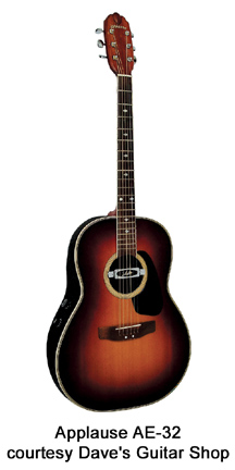 AE 32 | - dreadnought style, black pickguard, five-stripe bound body/rosette, deep bowl, 14/20-fret bound fingerboard with pearl diamond inlay, three-per-side tuners, available in Natural finish, disc. |