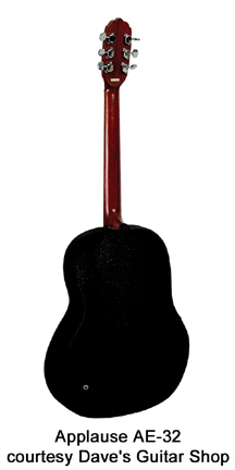 AA 35 | - dreadnought style, black pickguard, five-stripe bound body/rosette, deep bowl, 14/20-fret fingerboard with pearl dot inlay, six-per-side tuners, optional electronics, available in Black or Natural finishes, current mfg. |