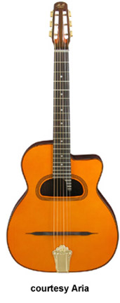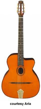 GYPSIE MM20 | - single cutaway Gypsie-style body, solid spruce top, small oval-shaped soundhole, rosewood back and sides, mahogany neck, 12/24-fret rosewood fingerboard that extends into the soundhole with pearl dot markers, open-style headstock with three-per-side gold banjo-style tuners, long rosewood bridge, gold metal tailpiece, available in Semi-Gloss Natural finish, mfg. 2005-present. |