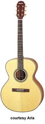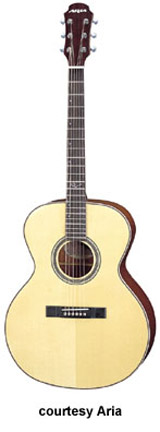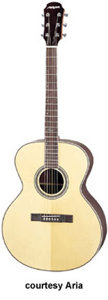ARIA/ARIA PRO II | ACOUSTIC: SANDPIPER SERIES | | SANDPIPER ASP-75 | - folk-style body, spruce top, solid mahogany back and sides, mahogany neck, 14/21 rosewood fingerboard, round soundhole, rosewood bridge, three-per-side chrome tuners, available in Black or Natural finish, current mfg. |