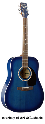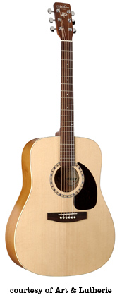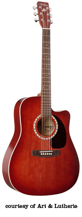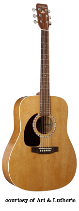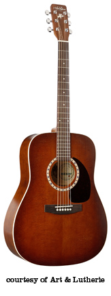 ART & LUTHERIE DREADNOUGHT | - three-ply wild cherry laminated top, wild cherry back/sides, round soundhole, big leaf maple neck, walnut fingerboard with a white dot inlay, solid headstock, three-per-side chrome tuners, black pickguard, and walnut bridge with white bridgepins, available in Almond Brown, Antique Burst, Sunrise, Black, Chestnut Brown (disc.), Trans. Blue/Blue, or Trans. Red/Burgundy satin lacquer or Anique Burst (2006-present) or Trans. Red (2006-present) Gloss Top finish, current mfg. |