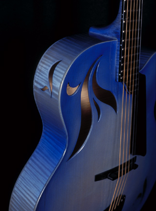 LIMELITE | - carved select aged spruce tops, carved flamed maple back with matching sides, three-piece flamed maple neck, large flared headstock, split fingerboard inlay, traditionally shaped bound pickguard, intricate inlay work on the pickguard/tailpiece, gold Schaller tuners with solid ebony buttons, disc. 1999. |