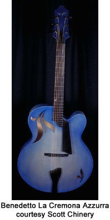 BENEDETTO GUITARS | ACOUSTIC ARCHTOP | Robert Benedetto's custom archtop guitars are individually handcrafted in the USA. Prices include hardshell case and Benedetto suspended jazz pickup. As of March 1, 1999, he no longer makes standard models. Used prices have been intentionally omitted, since each Benedetto instrument must be appraised individually to ensure accurate value. All current instruments are custom order only, one-of-a-kind, and individually handmade with prices starting from $60,000. Effective March 1, 1999, Benedetto has licensed his name to Fender Musical Instruments Corporation for his standard models to be made by Guild at the Guild custom shop in Corona, CA. Initially, the first three Benedetto models listed below were offered by Guild. Additionally, Benedetto personally worked with and instructed Guild's custom shop guitar makers as to the exact specifications of his model designs. The Frank Vignola model was manufactured during 2004-2005. This Django-esque Benedetto guitar, designed by acoustic jazz master Frank Vignola, featured an arched top and back. Benedetto plans on producing his line of carved archtops, including the Bravo, Fratello, Manhattan, and the La Venezia, under his own trademark at his new facility during 2007. | AMERICANA | - 18 in.body width, carved select aged spruce tops, non-cutaway body, carved select flamed maple back with matching sides, black/white binding, three-piece flamed maple neck, large flared headstock, neo-classical (no inlays) fingerboard, narrow Chuck Wayne-style finger rest, gold Schaller tuners with solid ebony buttons, disc. 1999. |
