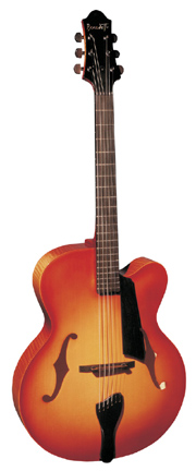 FRANK VIGNOLA MODEL (NO. 395-9905) | - single cutaway acoustic archtop, carved hand graduated and tuned select Sitka spruce top, carved two-piece select mahogany back and matching sides, one-piece mahogany neck, 21-fret ebony fingerboard with 12th fret abalone inlay, three-per-side black chrome Schaller mini tuners with ebony buttons, adjustable ebony bridge, black hardware plating, available in Natural, Natural with Bordeaux back and sides, Natural with Espresso back and sides, or Opulent Brown finish, mfg. 2005-07. |