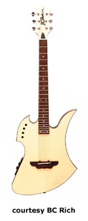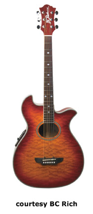 B.C. RICH | ACOUSTIC: EAGLE & THINLINE SERIES | | EAGLE | - double cutaway, ash body, quilted maple top, mahogany neck, 20-fret rosewood fingerboard with diamond inlay, rosewood bridge, three-per-side chrome tuners, four-band active EQ, available in Natural, Trans. Black, or Trans. Amber finish, mfg. 2003-06. |