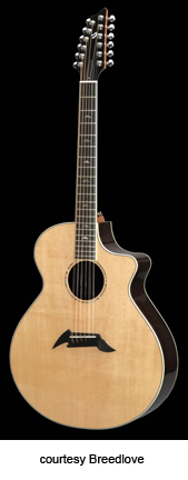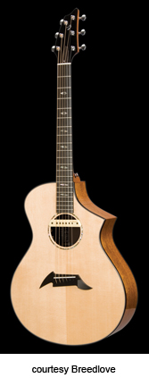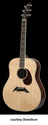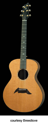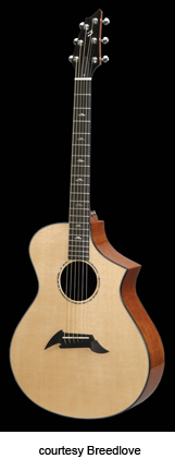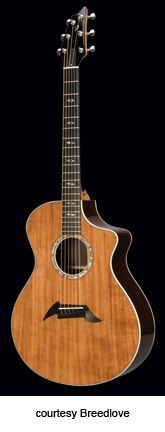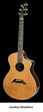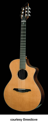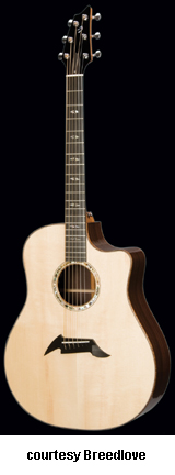 BOSSA NOVA | - concert-style deep single cutaway body (SN25), Western Red Cedar top, Indian Rosewood back and sides, abalone ring with purflingrosette, 14/20-fret ebony fingerboard with Breedlove B inlays, ebony headstock overlay, ebony bridge, top purfling, three-per-side chrome tuners, Baggs Dual Element electronics, Natural finish, mfg. 2000-present. |
