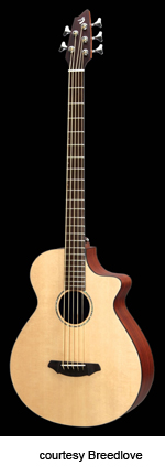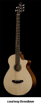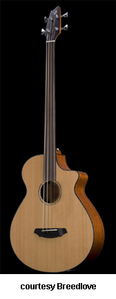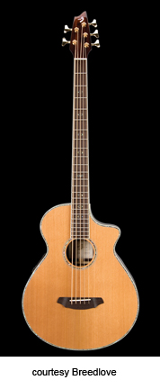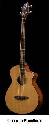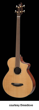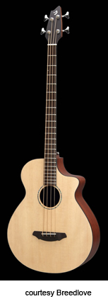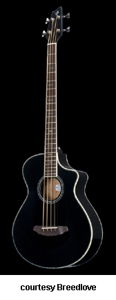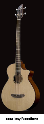 BREEDLOVE | ACOUSTIC ELECTRIC BASS | All basses are part of the Atlas series, except for a model Breedlove produced in the early 1990s. Retail price was around $2,800. | ABC25/SM 4 BASS | - single soft cutaway deep Grand Concert bass-style body, solid Sitka spruce top, solid mahogany back and sides, abalone rosette, ivoroid binding, 22-fret rosewood fingerboard with offset dot inlays, black headstock overlay with two-per-side chrome tuners, rosewood bridge, Fishman Classic IV electronics, Gloss Black finish, 32 in. scale, mfg. 2008 only. |