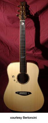 BERTONCINI STRINGED INSTRUMENTS | Guitars currently produced in Olympia, WA since 1995. | Dave Bertoncini builds custom-made acoustic, acoustic/electric, and electric guitars as well as mandolins in his one person shop. Each guitar is entirely custom-made by him, which allows the customer to choose what he or she wants. Dave usually has ongoing projects, but he encourages customers to request special orders so he can start from scratch on the instrument of choice. For more information, visit Bertoncini's website or contact him directly (see Trademark Index). | |
