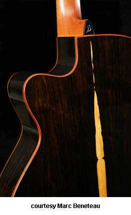 BENETEAU GUITARS | Guitars currently produced in St. Thomas, Ontario, Canada since 1974. | Luthier Marc Beneteau builds custom flattop acoustic guitars in his St. Thomas shop. Beneteau met Jean Larrivee of Larrivee Guitars in 1974 and decided to start building his own acoustic guitars. Currently, Beneteau offers several body styles available in many wood selections and other options. Prices start around $5,000 and he builds about twenty-five guitars a year. For more information, visit Beneteau's website or contact him directly (see Trademark Index). | |