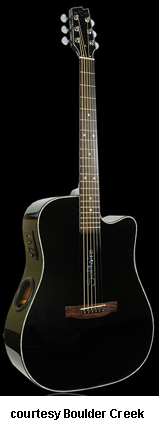 BOULDER CREEK GUITARS | Guitars currently produced. Distributed by Morgan Hill Music in Morgan Hill, CA. | Boulder Creek Guitars are built with a new type of bracing called the Suspended Bracing System (SBS). For over 150 years, guitar builders have been using the standard X pattern bracing style on all acoustics. Mike Shellhammer, who is the designer for Boulder Creek Guitars, wanted to increase sustain and vibration, and his experiments resulted in the SBS. SBS has less points of contact in the guitar and less rigid bracing around the bridge that allows the top to vibrate more. Shellhammer also eliminated the traditional soundhole on the top and replaced it with a side port (standard soundholes on the top that still utilize the SBS are also available in the Stage and Studio series). The Solitaire Series are available in a variety of configurations and tonewoods. For more information, visit Boulder Creek's website or contact them directly (see Trademark Index). | |
