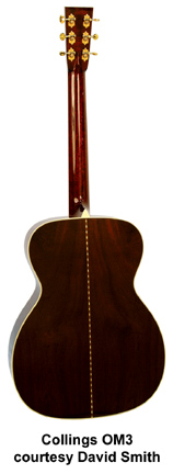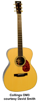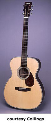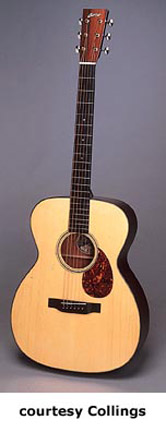 COLLINGS GUITARS | ACOUSTIC: OM MODELS | | OM-1 | - grand concert style, spruce top, round soundhole, tortoiseshell pickguard, three-stripe bound body/rosette, mahogany back/sides/neck, 14/20-fret bound ebony fingerboard with pearl dot markers, ebony bridge with white black dot pins, rosewood veneer on bound peghead with mother-of-pearl logo inlay, three-per-side chrome Gotoh tuners, available in Natural finish, total length: 39.5 in., body length: 19.25 in., body width: 15 in., body thickness: 4.125 in., 25.5 in. scale, mfg. 1986-present. |