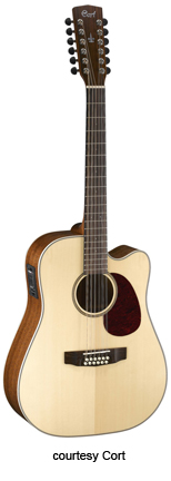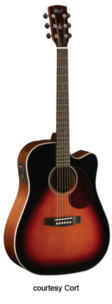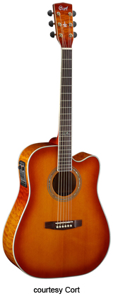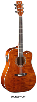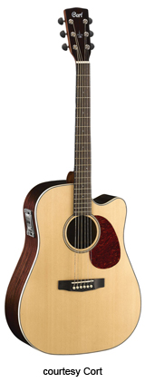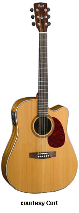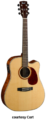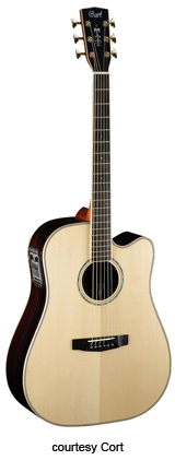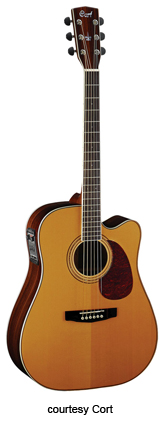 MR CUSTOM | - dreadnought single cutaway, master grade solid Engelmann spruce top, solid rosewood back and sides, mahogany neck, 14/20 ebony fingerboard with pearl dot inlay, ebony bridge, flamed maple wood binding on body, fretboard, and headstock, abalone soundhole rosette, Grover three-per-side Super Rotomatic tuners, Fishman Prefix Plus & Matrix pickups, gold hardware, Natural finish, made in the Cort Custom Shop, mfg. 2002-07. |