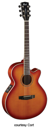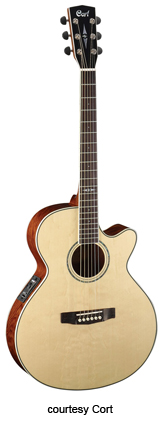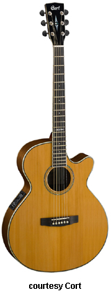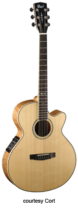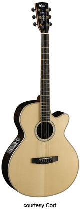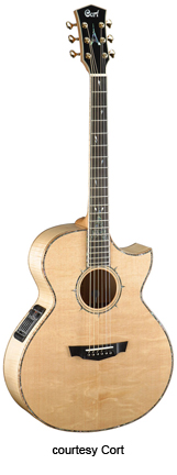 SFX CUSTOM | - single cutaway thin body, master grade solid Engelmann spruce top, solid rosewood arched back and sides, mahogany neck, 14/20 ebony fingerboard with pearl dot inlay, ebony bridge, flamed maple wood binding on body, fretboard, and headstock, abalone soundhole rosette, Grover three-per-side Super Rotomatic tuners, Fishman Prefix Plus & Matrix pickups, gold hardware, Natural finish, made in the Cort Custom Shop, mfg. 2006-07. |
