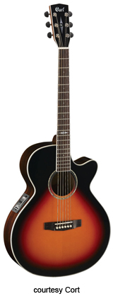 SF-A | - folk single cutaway body, solid spruce top, mahogany or maple back/sides, mahogany neck, 14/20 fret rosewood fingerboard with pearl dot inlay, binding, abalone soundhole rosette, CE-300 active EQ & Slim Jim pickup, three-per-side tuners, chrome hardware, available in Natural, Natural Satin, or Sunburst Satin finishes, disc. |