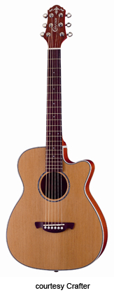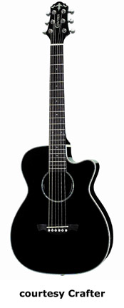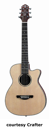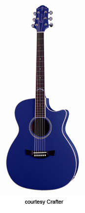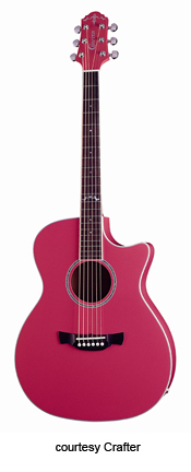 CUTE | - single cutaway grand auditorium body style, spruce top with T-bracing, maple back and sides, multi-ply body binding, abalone rosette, 14/20-fret bound rosewood fingerboard with abalone dot and 12th fret design inlays, matching finish headstock with three-per-side chrome tuners, rosewood bridge, L.R. Baggs Element pickup and LR-T Pro preamp, available in Black, Marine Blue Sunburst, Pink, Purple, or Tobacco Sunburst finish, mfg. 2007 only. |