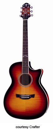 AGE-500TM | - single cutaway small jumbo-style body, tiger maple top, tiger maple arched back, tiger maple sides, round soundhole with abalone rosette, multi-ply body binding, mahogany neck, 14/21-fret Indonesian rosewood fingerboard with abalone inlays, matching finish headstock, three-per-side chrome tuners, Indonesian rosewood bridge, CR-T DV electronics, available in Marine Sunburst, Orange Sunburst, or Vintage Sunburst finish, 25.5 in. scale, new 2008. |