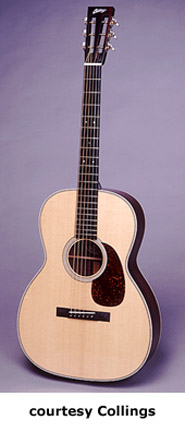 COLLINGS GUITARS | ACOUSTIC: 0, 00, & 000 MODELS | | 01 14-FRET | - 0 style, spruce top, mahogany back/sides/neck, round soundhole, tortoise binding, black/white wood strip rosette, 14/20-fret bound ebony fingerboard with pearl dot markers, rosewood veneer on bound open-style peghead with MOP logo inlay, three-per-side nickel Waverly tuners, ebony bridge with white black dot pins, tortoiseshell pickguard, available in Natural finish, total length 38 in., body length: 18 3/16 in., body width: 13 7/16 in., body thickness: 4.125 in., 24.875 in. scale, mfg. 2006-present. |