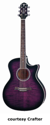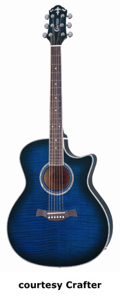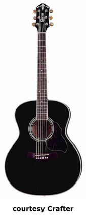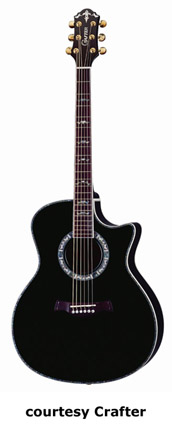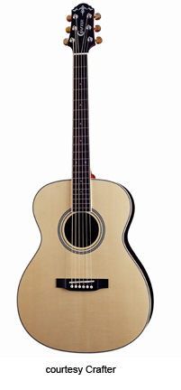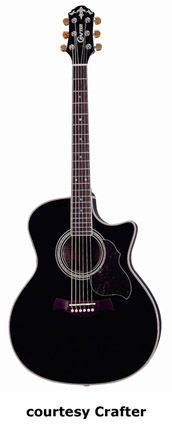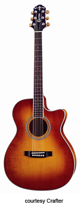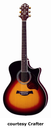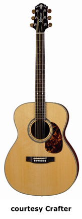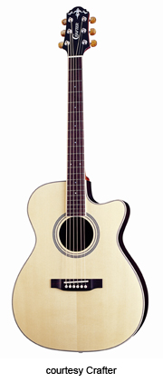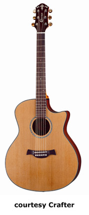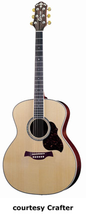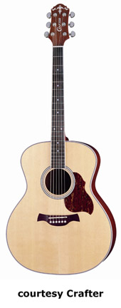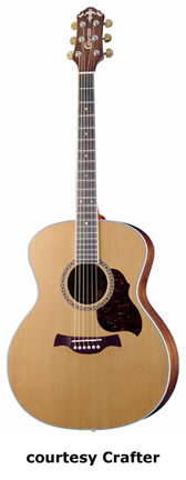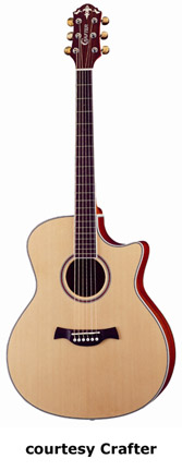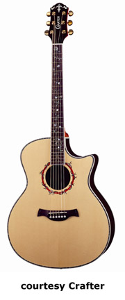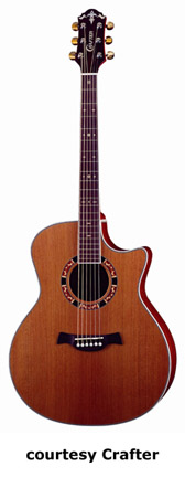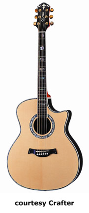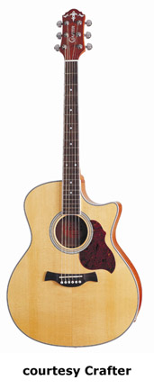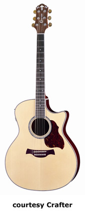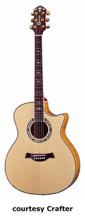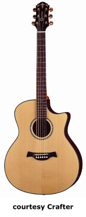 GAE-36 | - single cutaway Grand Auditorium style, solid Englemann spruce top, rosewood back and sides, abalone body binding, Crafter soundhole inlay, 14/20-fret rosewood fingerboard with abalone hexagon inlays, Mushroom buttons, pickup, electronics, gold hardware, Natural Gloss finish, current mfg. |