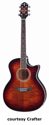 GAE-33 | - single cutaway Grand Auditorium style, solid Englemann spruce top, quilted maple back and sides, abalone body binding, Crafter soundhole inlay, 14/20-fret rosewood fingerboard with abalone elegant design inlays, Mushroom buttons, pickup, electronics, gold hardware, Natural Gloss finish, current mfg. |