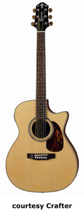 GAE-15 | - single cutaway Grand Auditorium style, solid cedar top, dao back and sides, wood Crafter soundhole inlay, 14/20-fret rosewood fingerboard with wood snowdrop inlays, Mushroom buttons, pickup, electronics, chrome hardware, Natural Satin finish, current mfg. |