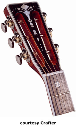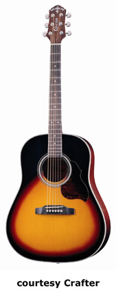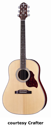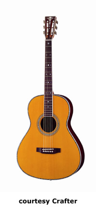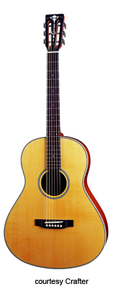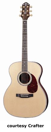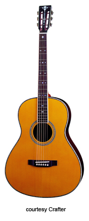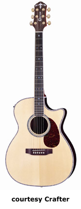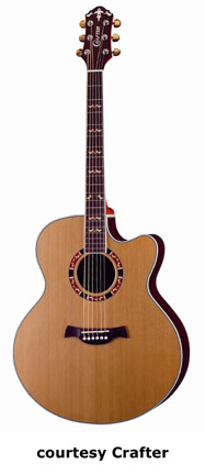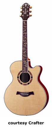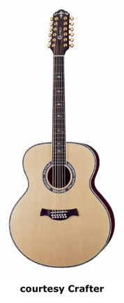 CRAFTER | ACOUSTIC: JUMBO, SOUTHERN JUMBO, AND FOLK MODELS | | FE-12 | - single cutaway small jumbo style, solid Sitka spruce top, dao back and sides, white binding, wood Padouck soundhole inlay, 14/20-fret rosewood fingerboard with tiny abalone dot inlays, Mushroom buttons, rosewood bridge, pickup, electronics, chrome hardware,NaturalSatinfinish, disc. 2005. |