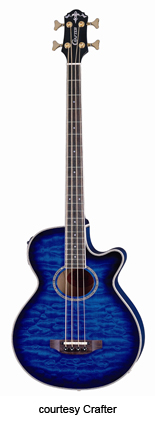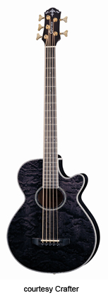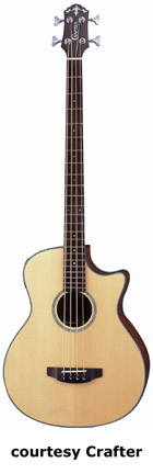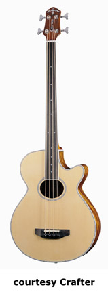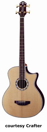 CRAFTER | ACOUSTIC ELECTRIC BASS | | BA-400 EQ | - single cutaway bass body, spruce top, white body binding, ashwood back and sides, 15/22-fret rosewood fingerboard with dot inlays, rosewood bridge, pickup, electronics, chrome hardware, Natural Satin finish, current mfg. |