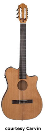 CL450 CLASSICAL | - single rounded cutaway hollowed-out mahogany body, AAA cedar top, round soundhole, through body neck, 21-fret ebony fingerboard with pearl dot inlay, ebony bridge with black pins, matching finish peghead with three-per-side banjo-style tuners, Fishman Acoustic Matrix pickup, active electronics, gold hardware, available in Natural or custom color finishes, mfg. 2001-present. |