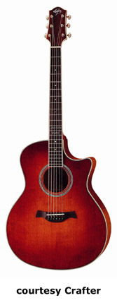 CRAFTER | ACOUSTIC: VINTAGE CLASSICS | Other Vintage Classic models were produced in 2005: the Oakland 55 (Last MSR $659), the Monroe 77 (Last MSR $729), and the Key West 99 (Last MSR $989). | RICHMOND 88 | - single cutaway dreadnought or grand auditorium body style, solid Sitka spruce top, tiger maple back and sides, abalone binding and rosette, 14/21-fret bound rosewood fingerboard with MOP dot inlays, bound headstock with three-per-side Antique tuners, rosewood bridge, clear pickguard, L.R. Baggs pickup and electronics, available in Gloss Sunburst finish, mfg. summer 2005-06. |
