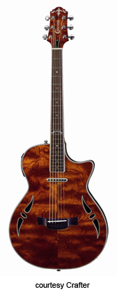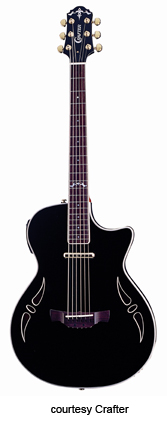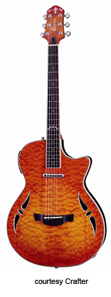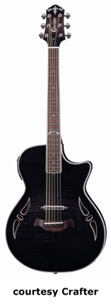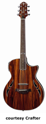 SA SLIM ARCH MODEL | - single cutaway slim arch body style, acoustic sound chamber, Andes Rosewood, bubinga, or tiger maple top, solid mahogany back and sides, two split bound S-holes, body and fingerboard binding, mahogany neck, 21-fret rosewood fingerboard with dot and 12th fret special MOP inlays, matching headstock with three-per-side chrome tuners, rosewood bridge, one exposed Kent Armstrong lipstick pickup, and an L.R. Baggs acoustic pickup, L.R. Baggs electronics with acoustic/electric blending, available in Natural, Sunburst, or Trans. Black finish, mfg. 2006-present. |