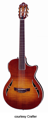 SAC Slim Arch Model Nylon String | - similar to the SA Slim Arch Model (Tiger Maple), except in nylon-string configuration, no fingerboard inlays, a slotted headstock with three-per-side open-style tuners, no exposed pickup, and an L.R. Baggs Element piezo pickup and electronics, available in Violin Sunburst finish, mfg. 2007-present. |