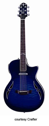 SAT-M SLIM ARCH MODEL | - single cutaway slim arch body style, acoustic sound chamber, arched spruce top, solid wood back and sides, two split bound S-holes, body and fingerboard binding, mahogany neck, 21-fret rosewood fingerboard with dot and 12th fret special MOP inlays, black headstock overlay, three-per-side chrome tuners, rosewood bridge, one exposed Kent Armstrong P-90 pickup, and an L.R. Baggs acoustic pickup, L.R. Baggs electronics with acoustic/electric blending, four knobs on lower treble bout (two v, two tone), available in Blue, Gold, or Silver finish, 25.5 in. scale, new 2008. |