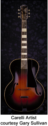 CARELLI | Instruments previously built in Chicago, IL circa mid-1930s. | Carelli archtop guitars were produced in the 1930s by the Harmony Guitar company. Harmony, well-known for producing an estimated fifty-seven "different" brands throughout its history, was the largest jobber production house in the history of guitar production. The Carelli trademark, or distributing company, is yet unidentified. Source: Jim Fisch, author (with L.B. Fred) of Epiphone: The House of Stathopoulo; and Gary Sullivan, owner of photographed guitar. | | ACOUSTIC ARCHTOP |