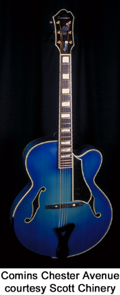 COMINS GUITARS | Instruments currently built in Willow Grove, PA beginning in 1991. | Bill Comins began playing guitar at an early age, and later went on to major in Jazz Guitar at Temple University. During this time, along with performing and teaching privately, Comins cultivated an interest in Luthery. Eventually he took a job in a violin shop where he worked for four years while building his own repair/custom shop business. In 1991, Comins met Master Luthier Bob Benedetto whose shared knowledge inspired Comins to develop his own line of archtop guitars. In the time since Comins has carved out a reputation as one of the more highly regarded contemporary archtop guitar builders. He has built over 200 instruments for international clientele consisting of players, educators, and collectors. His work has appeared in numerous books and collections, including the Chinery "Blue Guitar" project. Well versed in both traditional and contemporary approaches, Comins offers personalized collaborations with dedicated attention to design and detail. For electric models, refer to the Blue Book of Electric Guitars. For more information, contact Comins directly or visit his website (see Trademark Index). | | ACOUSTIC |