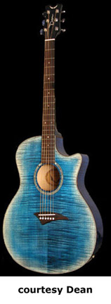 EXOTICA FM (MODEL EFM) | - single cutaway hollow flame maple body, flame maple top, mahogany set neck, 21-fret rosewood fingerboard with dot position markers, abalone soundhole inlay, multi-ply binding, Dean Electronics, Grover tuners, chrome hardware, available in Trans. Black, Trans. Blue, Trans. Green (disc.), Trans. Red, or Gloss Natural finish, 25.25 in. scale, mfg. 1999-present. |