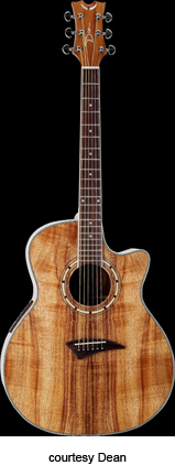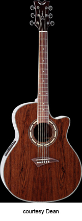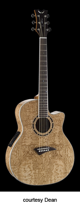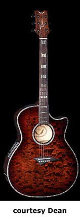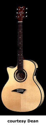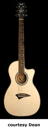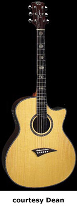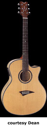 EXOTICA NOMAD (MODEL ENA) | - small auditorium single cutaway body, spruce top, mahogany back and sides, round soundhole with wood and abalone rosette, maple body and neck binding, 14/21-fret rosewood fingerboard, three-per-side tuners, rosewood bridge, Dean electronics, chrome hardware, Natural finish, mfg. summer 2004-present. |