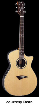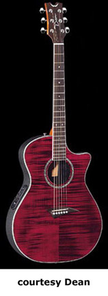 - single rounded cutaway body, flame maple top, fiberglass composite back and sides, mahogany neck, 14/20-fret rosewood fingerboard with pearl dot inlay, three-per-side chrome tuners, multi-ply binding, abalone soundhole inlay, Dean Electronics, available in Gloss Natural, Trans. Blue, Trans. Brownburst, or Trans. Red finish, mfg. 2000-06. |