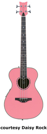 DAISY ROCK | ACOUSTIC BASS | | PIXIE BASS | - composite oval back, spruce top, mahogany neck, 22-fret rosewood fingerboard with daisy inlays, matching color headstock with two-per-side tuners, Daisy Custom Piezo electronics, chrome hardware, available in Powder Pink or Sky Blue finishes, mfg. 2003-04. |