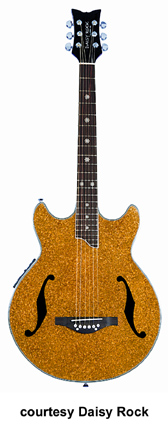 DAISY ROCK | ACOUSTIC: STARDUST SERIES | | ACOUSTIC/ELECTRIC SPARKLE GUITAR | - double cutaway hollow body, composite oval back, glitter top, f-holes, mahogany set neck, 22-fret rosewood fingerboard with daisy inlays, three-per-side tuners, Custom Piezo electronics, chrome hardware, available in Gold Sparkle or Pink Sparkle finish, mfg. 2004-05. |