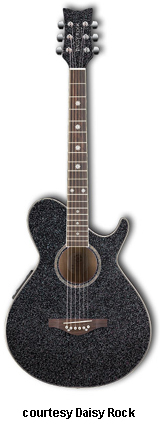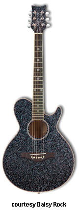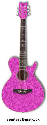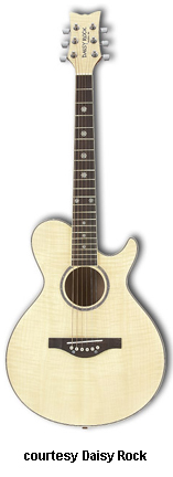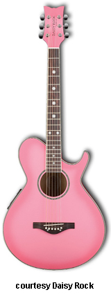 DAISY ROCK | ACOUSTIC: WILDWOOD SERIES | | WILDWOOD | - single cutaway folk style body, maple back and sides, or flame maple top with Natural finish, set mahogany neck, 21-fret rosewood fingerboard with daisy inlays, matching headstock with three-per-side tuners, rosewood bridge, chrome hardware, available in Atomic Pink (new 2008), Bleach Blonde, Pink Burst, Purple Daze (2006-present), or Rainbow Sparkle finish, mfg. 2005-present. |