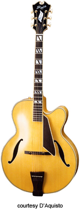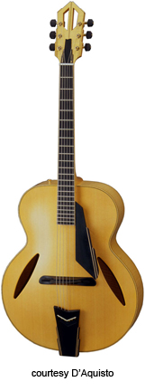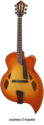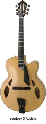 D'AQUISTO (CURRENT MFG.) | ACOUSTIC ARCHTOP | For models that have electronics, refer to the Blue Book of Electric Guitars. | AVANTE GARDE | - non-cutaway full-body archtop, solid Sitka spruce top, flame maple back and sides, two teardrop-style soundholes, one-piece maple neck, 22-fret ebony fingerboard, matching headstock with two slots and three-per-side tuners, ebony Accutone adj. bridge, ebony tailpiece, small ebony fingerboard, gold hardware, available in Natural finish, 17 in. width, 25.5 in. scale, mfg. 2002-present. |