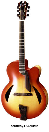 CENTURA | - single cutaway full-body archtop, solid Sitka spruce top, flame maple back and sides, two teardrop soundholes, one-piece maple neck, 22-fret ebony fingerboard, standard headstock with three-per-side tuners, ebony Accutone adj. bridge, ebony tailpiece, small ebony fingerboard, gold hardware, available in Centura Red (Sunburst) or Natural finish, 17 in. width, 25.5 in. scale, mfg. 2002-present. |