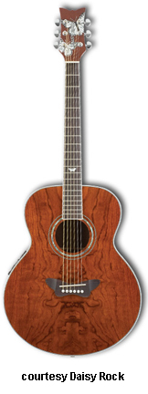 - jumbo-style body, bubinga top, back, and sides, round soundhole with abalone pearl rosette, white binding, multi-layer top purfling, bubinga neck, 14/20-fret bound rosewood fingerboard with 12th fret butterfly inlya, matching finish headstock overlay with butterfly graphics, three-per-side chrome tuners, butterfly-shaped rosewood bridge, Daisy Rock Custom Piezo System electronics, available in Bubinga Butterfly (Natural) finish, 25.5 in. scale, gig bag included, new 2008. |