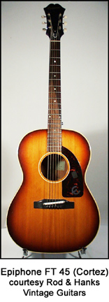 FT 45 (CORTEZ) | - OO style, spruce top, round soundhole, tortoise pickguard, white body binding, walnut back/sides, cherry neck, 20-fret rosewood fingerboard with pearl dot inlay, rosewood bridge with white pins, metal logo plate mounted on peghead, three-per-side tuners, available in Natural or Sunburst finishes, 14.5 in. body width, mfg. 1941-49, 1958-1970. |