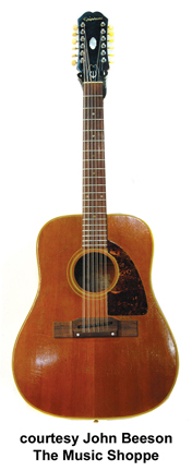 FT 112 (BARD) | - 12-string configuration, spruce top, mahogany back/sides, multiple-bound body, adj. saddle, stylized E logo, oval peghead inlay, Sunburst or Walnut finishes, 24.75 in. scale, 16.25 in. width, mfg. 1962-69. |