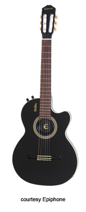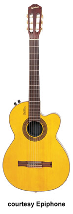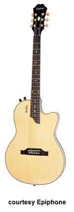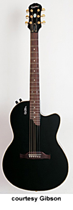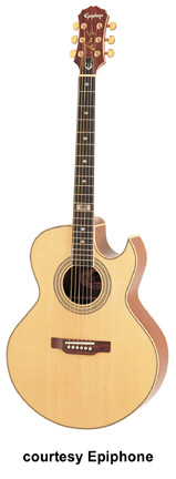 EPIPHONE | ACOUSTIC ELECTRIC: SIGNATURE SERIES | | CHET ATKINS SST STUDIO (MODEL ECSS) | - semi-solid thinline acoustic, mahogany set neck, maple top, rosewood fingerboard with dot inlays, three-per-side tuners, Shadow piezo pickup, passive electronics, gold hardware, available in Ebony, Heritage Cherry Sunburst (disc. 2000), or Natural finishes, disc. 2005. |
